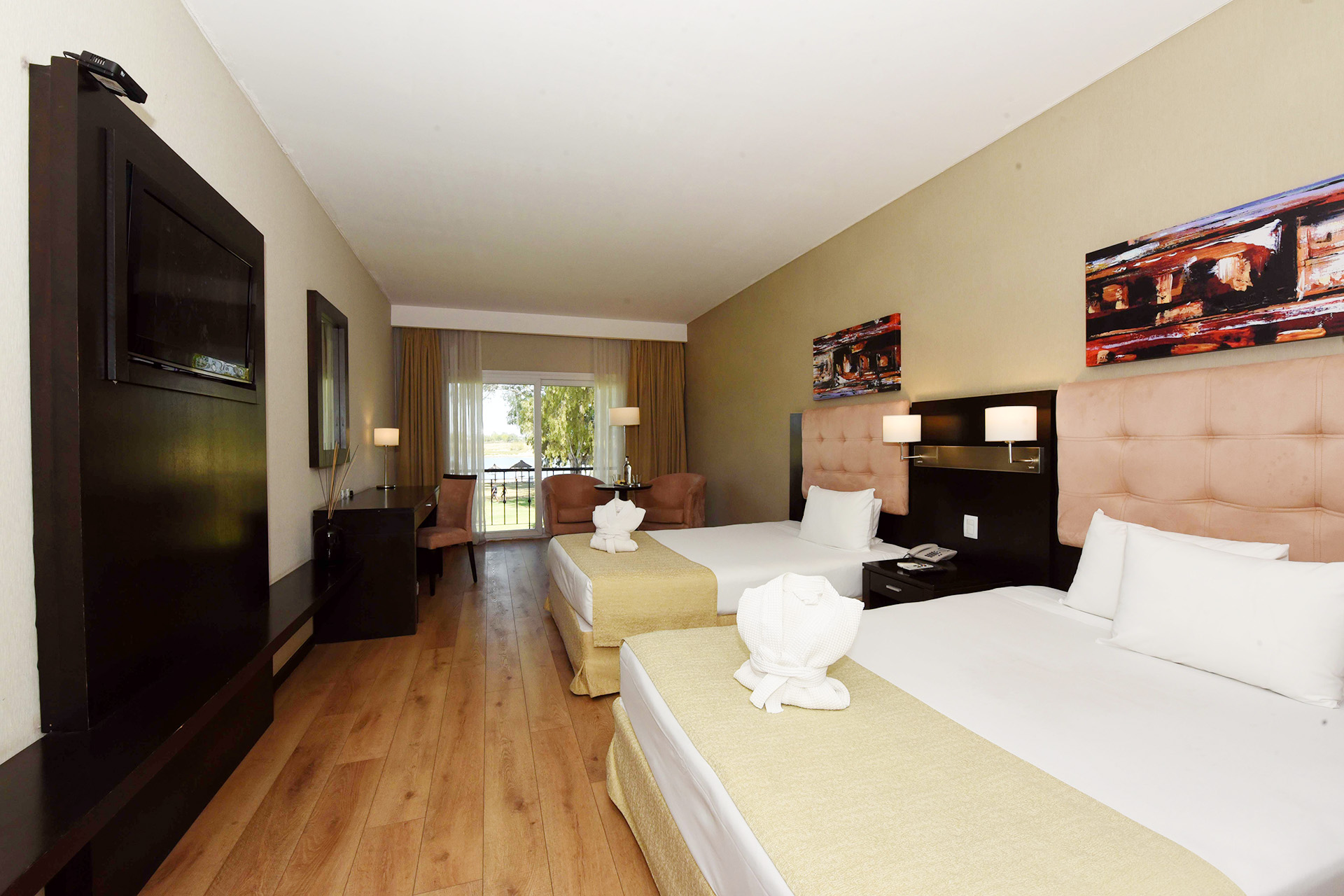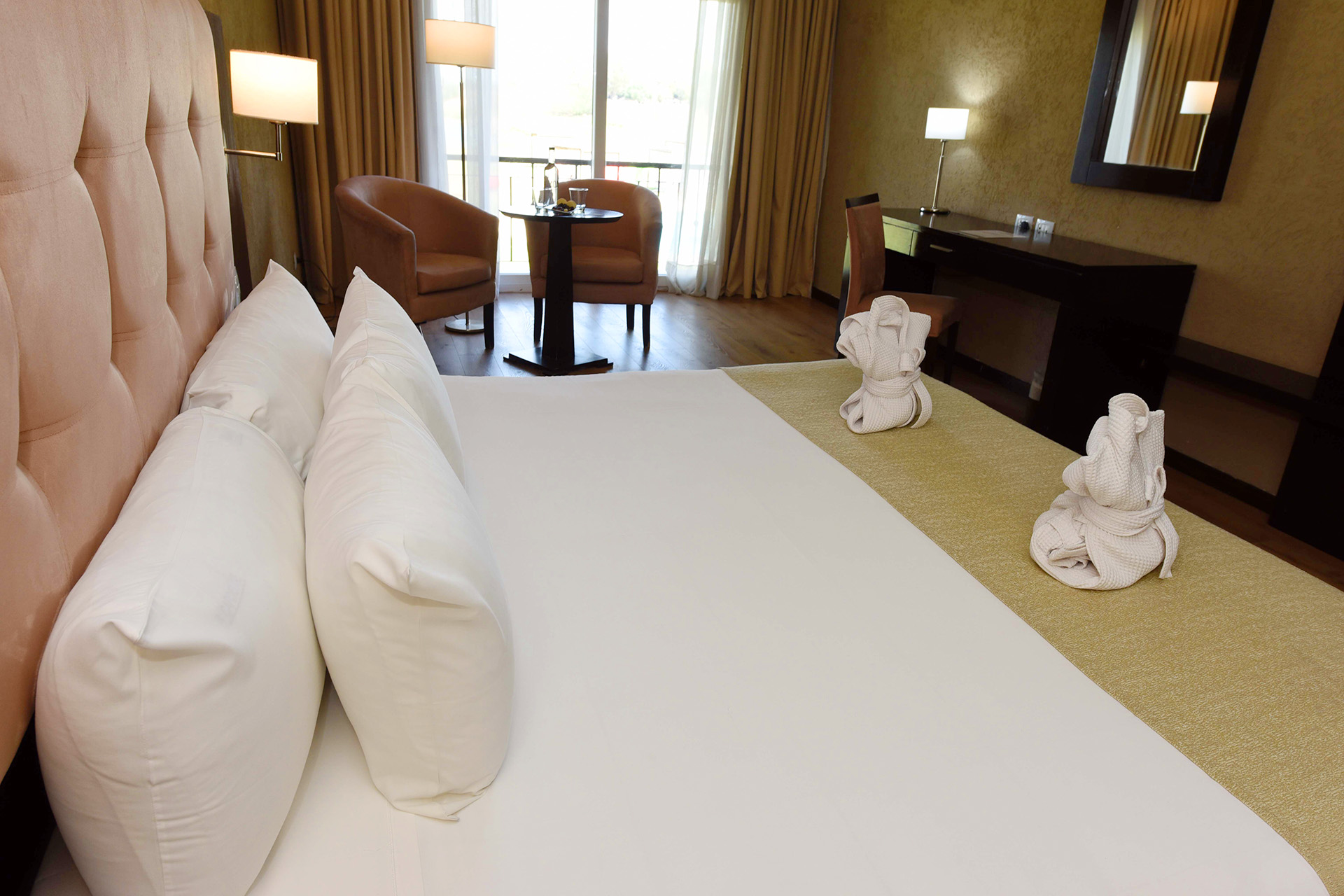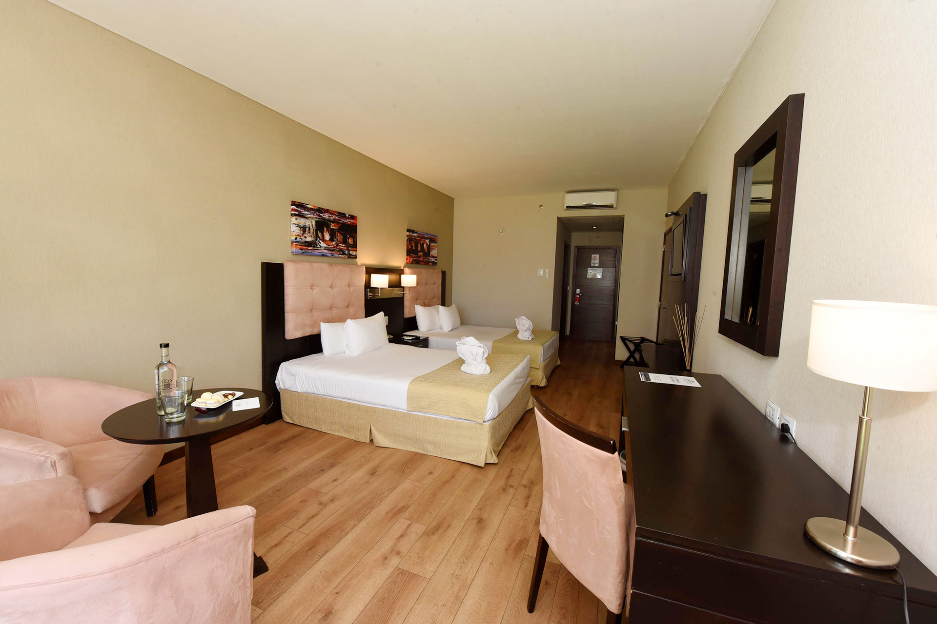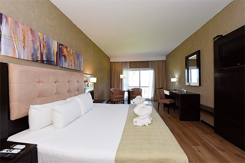 Disfrute de una Junior Suite exclusiva de 30 m², amueblada con una decoración elegante, un televisor led y conexión inalámbrica a Internet de cortesía. Incluye cama King o Twin, almohadas de espuma, cómodo edredón, balcón con la increíble vista al campo o a la laguna, amplio escritorio de trabajo y un baño con ducha.
